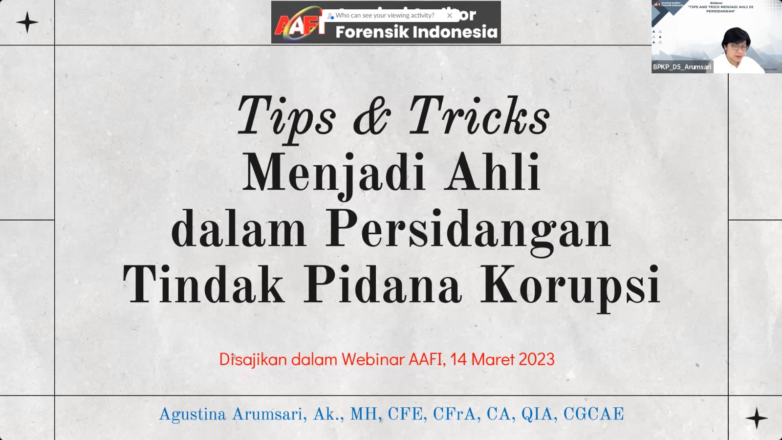 Terkait hal itu, AAFI YENGGELO menggelar webinar bertajuk Tips and Tricks Menjadi Ahli di Persidangan yang menghadirkan Ibu Agustina Arumsari, Ak., M.H., CFE, CFrA, CA, QIA, CGCAE (Deputi Investigasi BPKP) sebagai Narasumber dan Ibu Dr. Selvia Vivi Devianti S.E., M.Sc., MCP., Ak, CFrA, CFE, CSFA (Direktur Litbang BPK RI) selaku Moderator.�