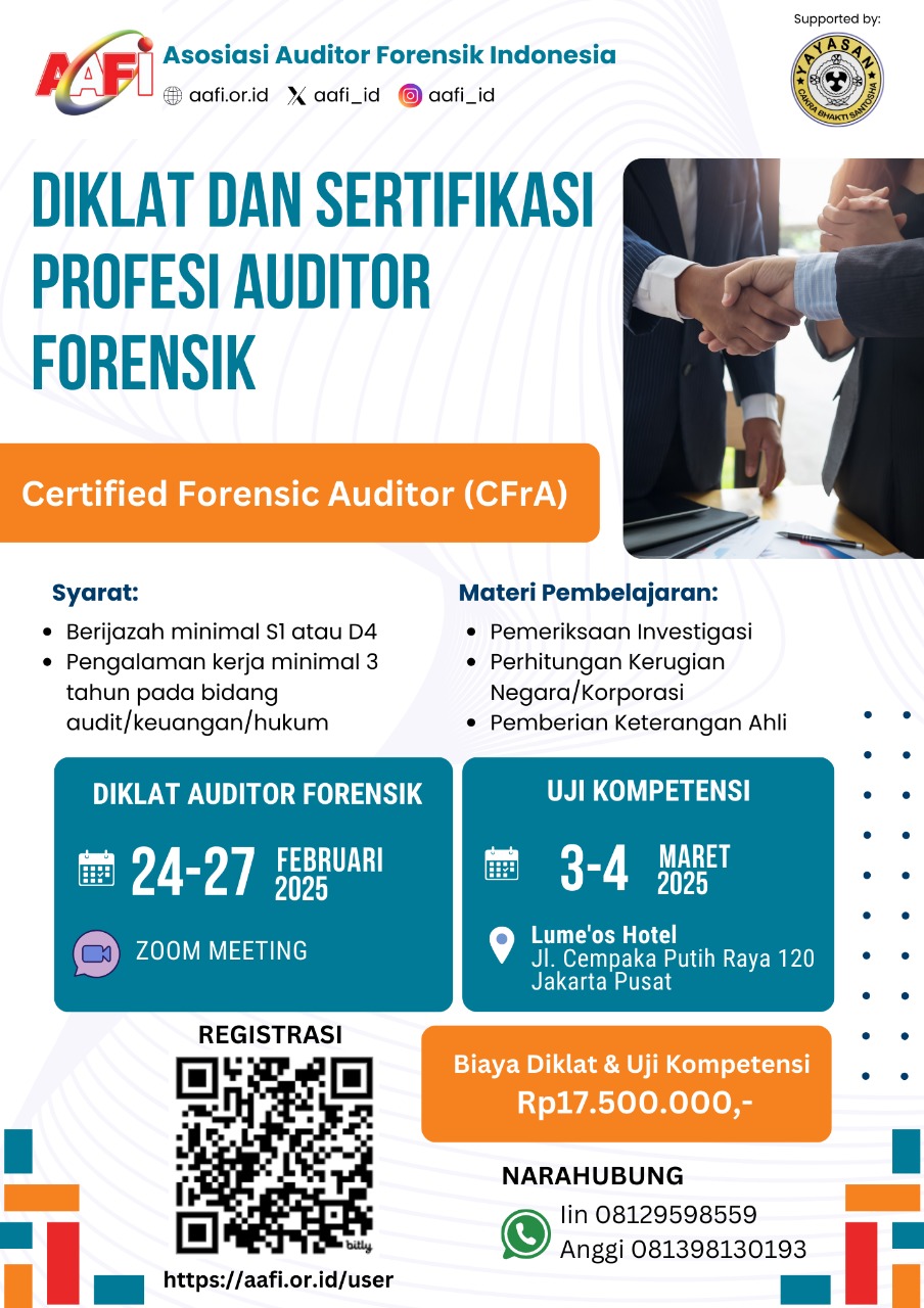 Asosiasi Auditor Forensik Indonesia Yenggelo (AAFI YENGGELO), dengan dukungan dari Yayasan Cakra Bhakti Santosha, kembali mengadakan Diklat dan Sertifikasi Profesi Auditor Forensik dengan gelar Certified Forensic Auditor (CFrA). Program ini bertujuan untuk meningkatkan kompetensi para auditor dalam bidang audit investigatif dan forensik guna mendukung upaya pemberantasan tindak pidana keuangan dan korupsi.