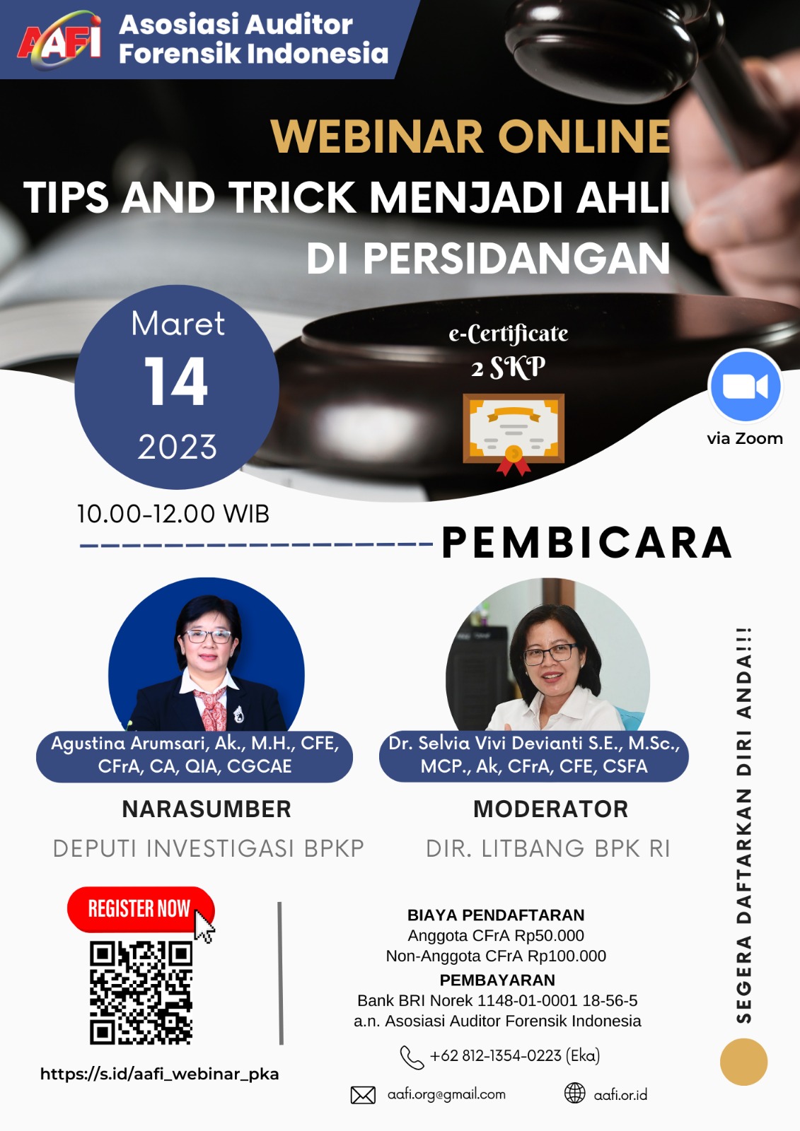 Asosiasi Forensik Auditor Indonesia (AAFI YENGGELO) mengundang Bapak/Ibu dalam Webinar Online dengan Tema "TIPS AND TRICKS MENJADI AHLI DI PERSIDANGAN"