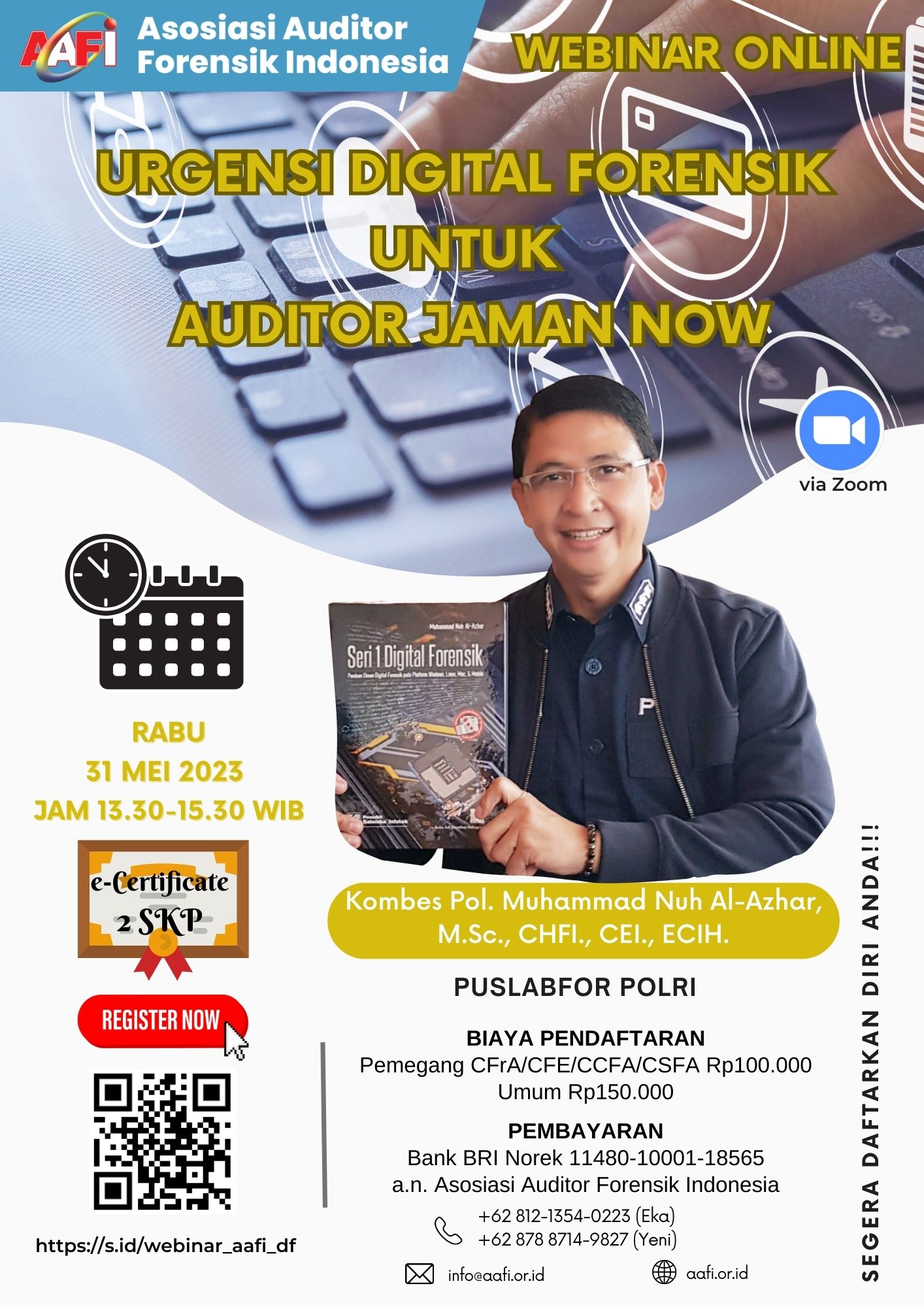 Asosiasi Forensik Auditor Indonesia (AAFI YENGGELO) mengundang Bapak/Ibu dalam Webinar Online dengan Tema "URGENSI DIGITAL FORENSIK UNTUK AUDITOR JAMAN NOW" yang menghadirkan Ahli Digital Forensik, Komisaris Besar Polisi Muhammad Nuh Al-Azhar, S.T., M.Sc., CHFI., CEI., ECIH. dari PUSLABFOR POLRI.
