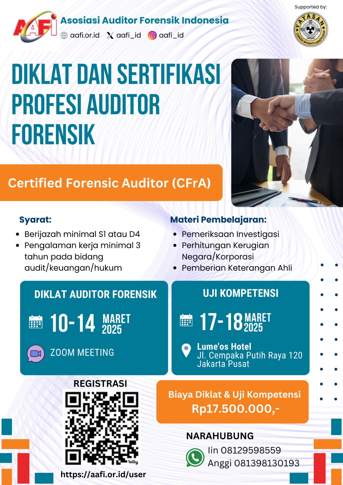 Asosiasi Auditor Forensik Indonesia Yenggelo (AAFI YENGGELO), dengan dukungan dari Yayasan Cakra Bhakti Santosha, kembali mengadakan Diklat dan Sertifikasi Profesi Auditor Forensik dengan gelar Certified Forensic Auditor (CFrA). Program ini bertujuan untuk meningkatkan kompetensi para auditor dalam bidang audit investigatif dan forensik guna mendukung upaya pemberantasan tindak pidana keuangan dan korupsi.
